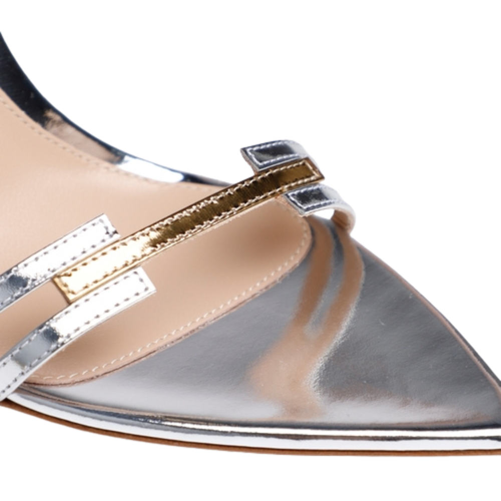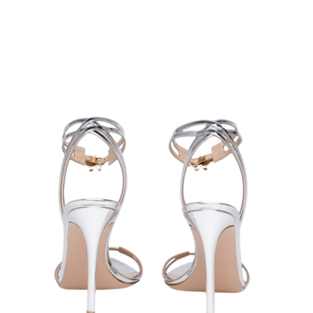 These sandals are crafted in silver leather and designed with an ankle strap silhouette. Suitable for evening or occasion wear they deliver shine and elegance with a streamlined profile. A refined sandal that complements formal and dress focused outfits.
